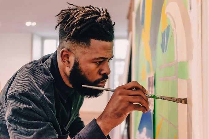 With a visual language in constant development, Blackson is inspired by the black body, which he represents in his paintings and affirms in society. He adds layers of color, creating sensations in the observer that seem contradictory at first sight but are harmoniously combined on the canvas. Between happiness and melancholy, harmony becomes the motto of his work and vision, where freedom and symbolism are recurrent and central aspects of his artworks. He has been experimenting with new mediums to express his art, such as tiles or installations.