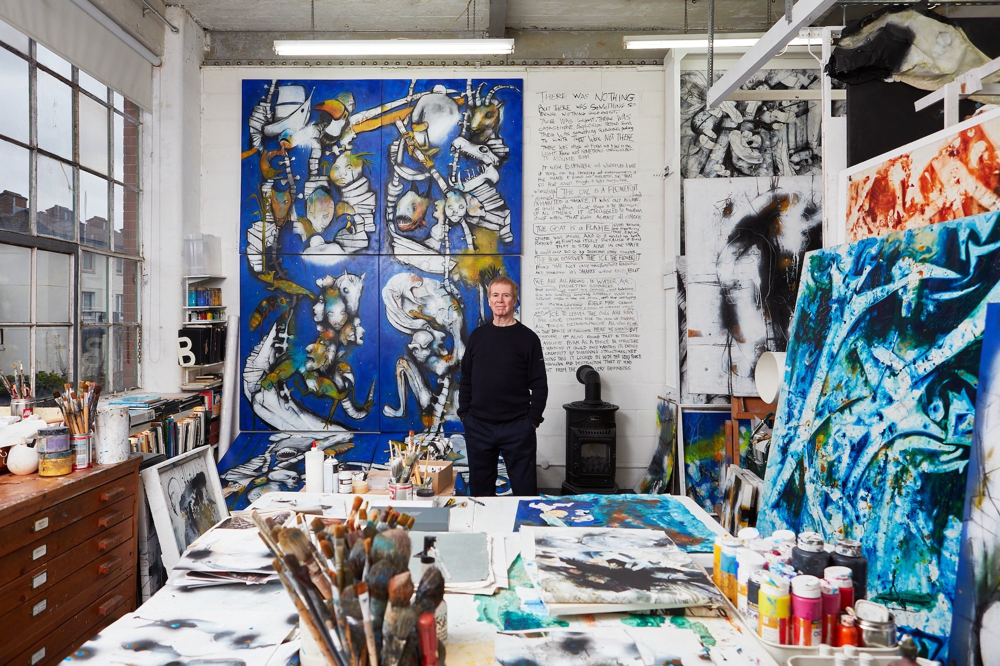 My current work crosses art forms with journeys of transformation, exploring issues of identity, dissolution and change while engaging the viewer on several levels. These ideas developed particularly in two recent exhibitions, ‘The Disappearance of Makepeace’ at the Bermondsey Project Space, and work created for the Milton Keynes Gallery Plus Tate exhibition ‘MK Calling’. In both cases they were underpinned by the narrative of a mystery thriller written with the support of Arts Council England, ‘The Disappearance of Makepeace - A Tale of Two Lives’, a graphic novel tracing the relationship of Eustace and Makepeace, from their first childhood meeting to their final encounter. It is a story of disappearance, loss and discovery, and is partly based on events in my own life, enabling me to distill ideas that have evolved over a period of time. The book itself has windows cut into the alternating pages with two ways of seeing, one the everyday life of Eustace, the other the magical visions of Makepeace, each looking into the other’s co-existing world. Similarly, in gallery exhibition, windows cut in some canvases open into other worlds, or soar up to the ceiling on cables, where combinations of animation, soundscape and text enable words and painting to interact in new ways; other work occupies a third space between drawing and sculpture, with dissolving planes that range from near abstraction to a hybrid realism, a magic workshop at that interchange of observation and dream where new kinds of art can still be developed.