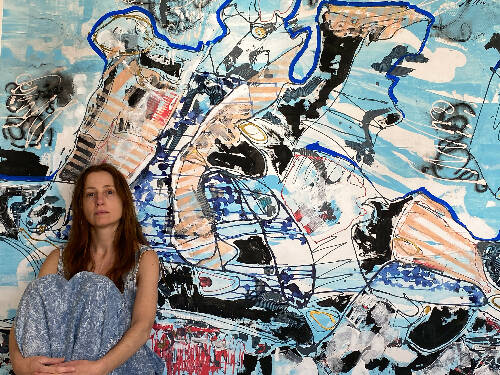 Acrylic, ink and markers on canvas. 39"/49", (98/125 cm). 2023