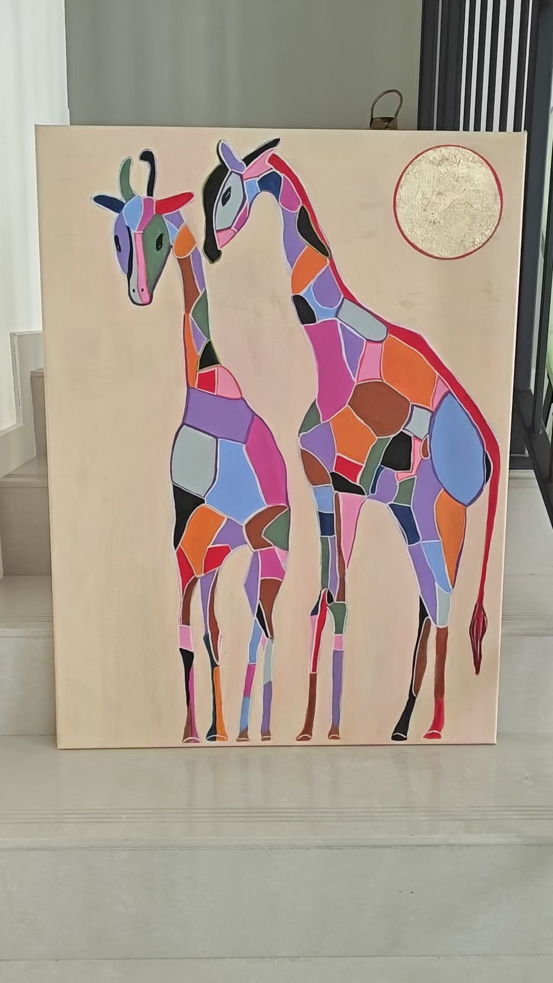 Measuring 68 x 91 cm, this acrylic painting on canvas is finished with a semi-gloss varnish that enhances its vivid colors while providing a durable, polished surface designed to last for years.