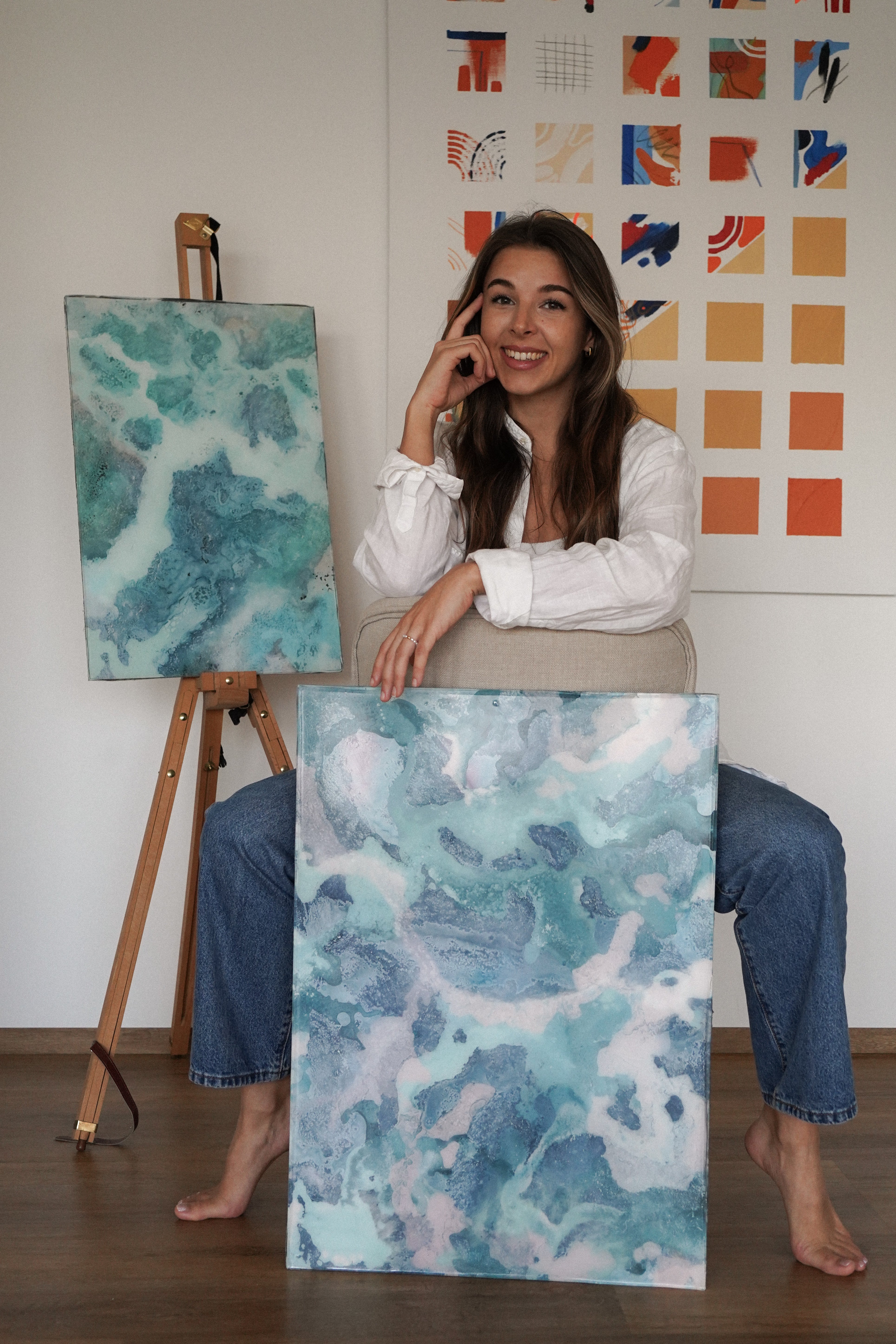 A unique abstract artwork on hardboard panel, envisioning a maritime atmosphere. The artwork contains layers of epoxy resin, creating a glossy surface and causes it to be quite heavy.