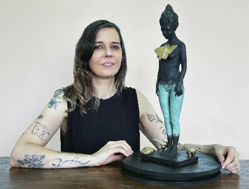 In LA CREACIÓN DEL MUNDO I aimed to portray the essence of a child’s innocence and wonder as they create and shape their world. A young girl stands on a textured globe, fragile yet strong, embodying the limitless possibilities of imagination. She holds a giant sunflower, which symbolizes creation, growth, and the beauty of life in its purest form.Children possess an extraordinary faith in their abilities, untainted by doubt or fear. They marvel at simple things—a flower, a breeze, or the earth beneath their feet—turning these moments into magical adventures. In this sculpture, the sunflower becomes her tool of creation, her connection to the universe and its mysteries.This piece reminds us that within every adult lies the bravery and wonder of childhood, often overshadowed but never entirely lost.