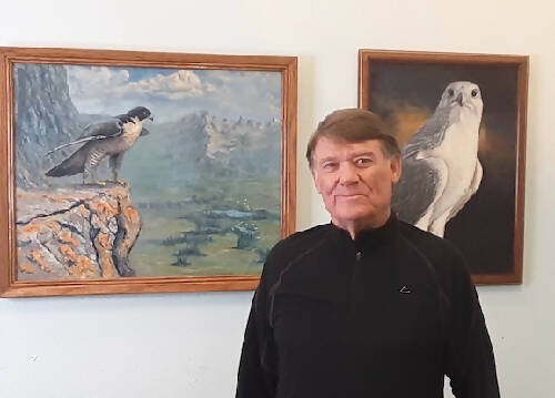 Oil painting of the Anatum Peregrine Falcon of the arctic, ascending from its cliff habitat. 24x36 inches on canvas. Original for sale, Prints are $425.